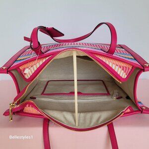 BRAND NEW WITH TAGS. Wild Raspberry Multi color. A stylish structured Tote with a spacious interior for your essentials. Features a drop top-zip closure plus interior pockets for easy organization. Designed in a trendy silhouette in a colorblocked design with a hanging logo for added detail. Crafted of soft woven straw with smooth leather trim.