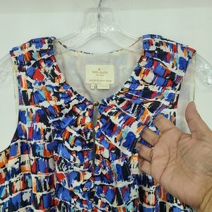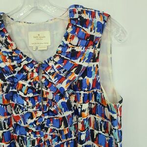 This pre-owned Kate Spade multicolored brushstroke print sleeveless dress in size 6 features an abstract pattern in blue tones, perfect for a party or casual occasion. Made from 100% silk, the dress has a round neck, zip closure, and ruffle accents, adding a stylish touch. The shift dress is lined and has a short length, making it ideal for the summer, fall, and spring seasons. Made in China, this dress from Kate Spade New York is sure to make a colorful statement in your wardrobe.