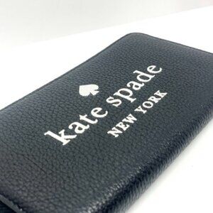 Beautiful KATE SPADE NEW YORK LARGE ACCORDION ZIP WALLET. Crafted in luxurious black pebbled leather with bold white logo lettering and silver-tone hardware. Zip-around style opens to an accordion-style interior with multiple compartments for cards, cash, and receipts — perfect for keeping everything organized in elegant Kate Spade fashion.