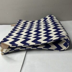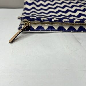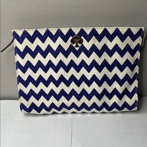 This is a beautiful KATE SPADE NEW YORK BLUE WHITE ZIG-ZAG PRINTED CANVAS ZIP POUCH. Can be carried as a clutch purse or make up bag. Lined wipeable interior. Goldtone hardware. 10” x 7” x 1.5”. No odors. No tears. A few super minor interior scuffs.