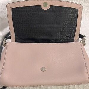 This gorgeous purse from Kate Spade has a font flap with magnetic closure, an attached chain strap, and an adjustable/removable leather crossbody strap. Very small stains on front of purse (two will be covered by flap closure), and the other is near the bottom front corner near the stitching. Both spots are shown in photos. There is a slip pocket on the front wall of the purse and a zippered pocket on the back wall of the purse. Purse measures approximately 11” across and 6-1/2” tall.