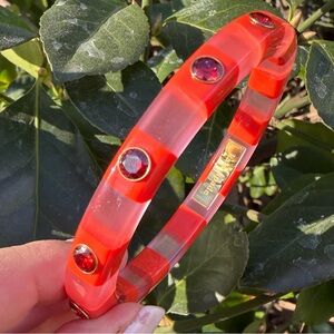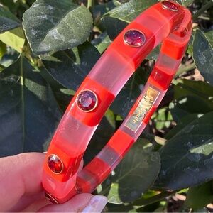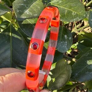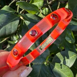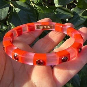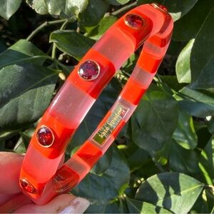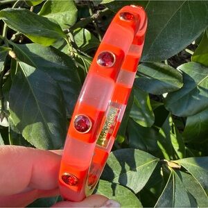 ABSOLUTELY GORGEOUS & VERY UNUSUAL KATE SPADE NY LUCITE / PLASTIC BANGLE BRACELET IN STRIKING ORANGE/ PINK COLOR COMBINATION WITH VIVID RED RHINESTONES.