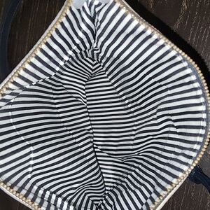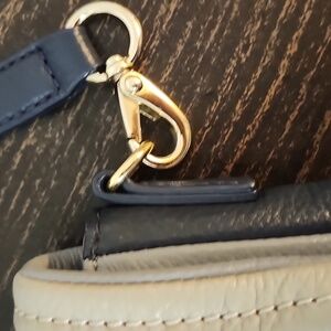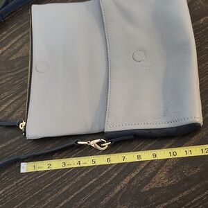 It is in very good condition. Measurements are in the pictures, it's very clean inside and out. Very nice, soft leather and tan Gray and black. It has a magnet for a closure and a zipper two compartments.