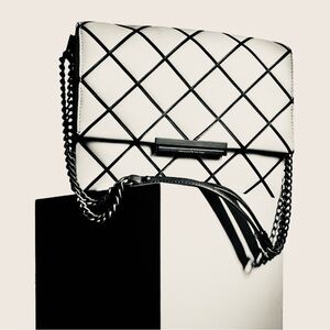 FEATURES: Push lock flap closure, squeeze to open, center divider, adjustable strap: shoulder-56", carry-28", exterior slip pocket, interior zip pocket, 2 interior slip pockets, black chain-use as a double strap or single strap, leather, fabric lined, criss cross pattern.