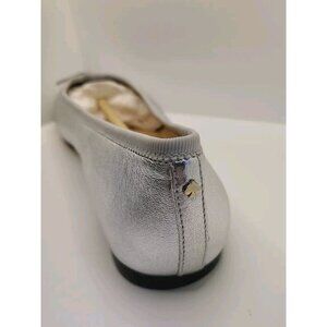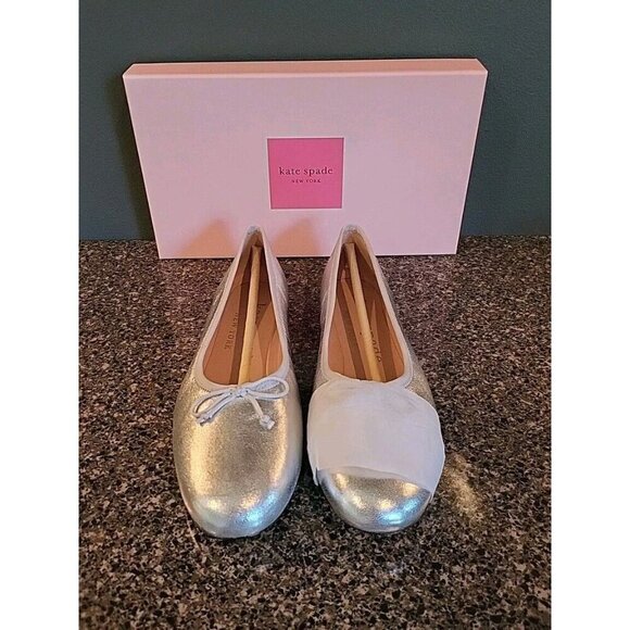 Elevate your shoe collection with these stunning Kate Spade New York Honey Metallic Leather Ballet Flats in size 9.5B. The sleek silver color and metallic finish add a touch of sophistication to any outfit. It has the cute little Spade logo in gold on the back of the shoe.