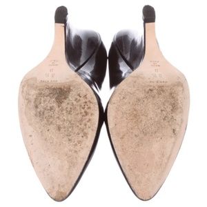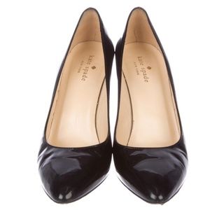 Black patent leather Kate Spade New York wedges with round-toes, tonal stitching and covered heels. Includes dust bag.