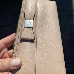 This item is the Kate Spade New York Nisha Renny Drive wallet. It is a slim, zip-around style crafted from textured leather, featuring a prominent bow embellishment with a metallic center plaque engraved with the brand's logo.
