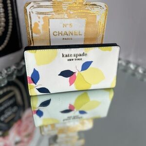 This elegant kate spade wallet features a vibrant floral design with white, yellow, and blue hues. Perfect for adding a touch of sophistication to your everyday essentials.