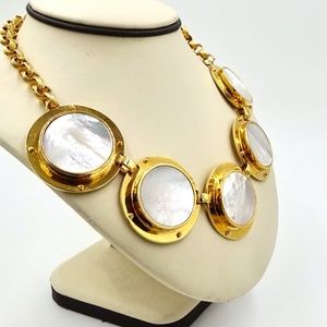 Kate Spade's All Aboard Collection celebrated cruises on the ocean, visiting ports of the world, and standing on deck with the crisp salty air blowing through your hair. It's like an imaginary get-a-away! Stylized mother of pearl portholes with distinctive detailing and design set in a stunning rolo link necklace! Perfect for beach and coastal style living.