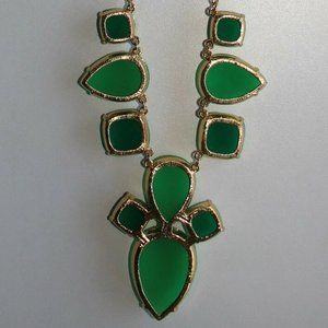 Description: Kate Spade New York Branton Square Green Stone Bib Necklace. Large, faceted jewels filled with magnetic color and shine form a slimming V at the base of a gilded statement necklace. Lobster clasp closure.