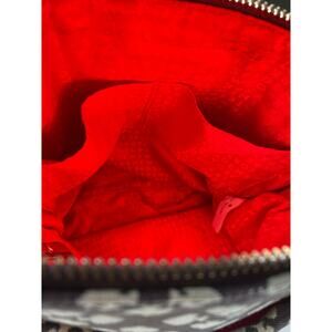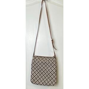 Canvas body with brown and white spade pattern throughout and vertical brown and red ribbon accents on front.