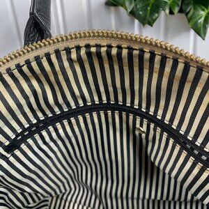 A medium size color block leather satchel by Kate Spade in willow/multi (grey and cream). Features include gold tone hardware, zippered top closure, and dual rolled black leather handles. Inside is black and white striped fabric lining with 1 zip and 2 slip pockets. Very good preowned condition, crossbody strap is missing but there are D-rings at either end of the bag to attach your own. See photos for more details. Happy to answer any questions!