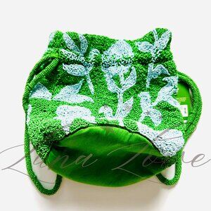 NWT! KATE SPADE New York x Target Beaded Classic Rose Drawstring Bucket In Green. Elevate your style with this stunning collaboration between kate spade new york and Target. This green and blue bucket and drawstring bag is perfect for any occasion, whether you're running errands or going out for a night on the town. There might be some beads missing throughout the bag, but this is a given for beaded bags. There are not huge areas that are missing large patches.