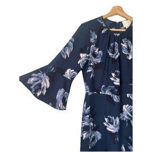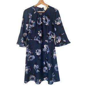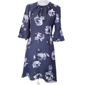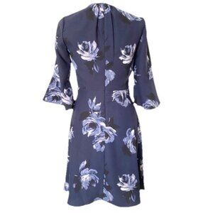 This KATE SPADE Night Rose Crepe Dress in size 6 features a beautiful floral navy pattern, making it perfect for a variety of occasions from casual outings to office wear. The dress has a crew neck, 3/4 flared sleeves, and a knee-length A-line silhouette for a classic and stylish look. Made from polyester crepe fabric with ruffle accents and a zipper closure, this designer dress is sure to make a statement whether you're heading to a party, cocktail event, or just a day at the office. Dry clean only to maintain its quality.
