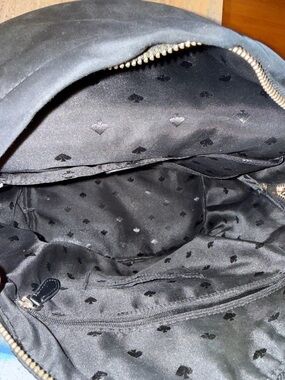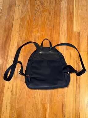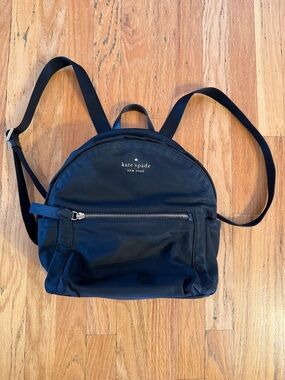 Sleek nylon backpack by kate spade. Front zip pocket and 2 side pockets for quick access. Adjustable shoulder straps for a custom fit. Top carry handle for easy grab-and-go. Minimal logo detailing on front. Excellent used condition. Measures approximately 10 x 11”.