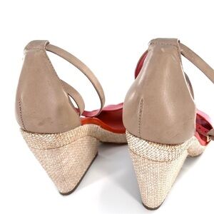 Beautiful pair of wedge heeled espadrille sandals from Kate Spade! Size 7.5, orange leather and patent leather, espadrille wedge heel, double wrap ankle strap. Heel height - 4 1/4". Some light markings as pictured (please zoom in to see) but still in great condition.