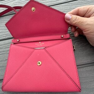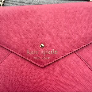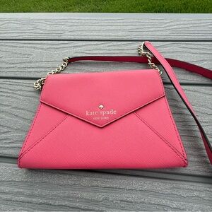 The Kate Spade pink Saffiano envelope flap crossbody bag that easily converts to a clutch with it’s removable strap. It is a perfect blend of style and functionality. This bag is ideal for those who appreciate a chic accessory that stands out while offering practicality for everyday use.