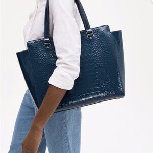 Top handle tote bag in matte lizard embossed leather.
