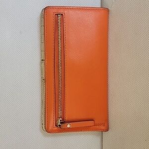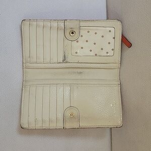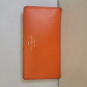 Used Kate Spade slim bifold wallet. The wallet is not in perfect condition. There is mark on the front. There are marks on the leather when opened. The wallet has love marks. Please see all pictures.