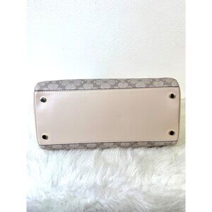 A spacious and elegant satchel bag crafted with durable spade flower jacquard and leather accents. Features a zippered closure, ensuring security, and dual handles for comfortable carrying. Its refined design is suitable for organized storage with a stylish presentation.