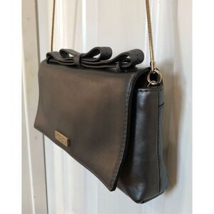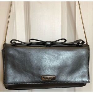 Very sweet vintage Kate Spade New York ♠️ metallic gunmetal gray Soft Leather 3-way Bag. Carry her as a clutch, a satchel, or pull out the gold snake chain to wear on your shoulder. She’s 9.5” x 5.5” by 1” with an optional 18” chain strap. She has a 4/5 front flap with metallic snap entry under the gold-tone Kate Spade logo plaque. Very tailored look! Adorable bow atop the bag that lifts up to carry as a satchel. Super clean gold-hued sateen lining with Kate Spade logo all over. Interior has a zippered compartment and leather Kate Spade logo plaque. This bag comes with a Kate Spade care card. Please see last photo for any minor callout spots. I find these spots disappear in certain light; and this is, overall, an adorable, clean and ready-to-carry bag. So tailored and classy! ♠️