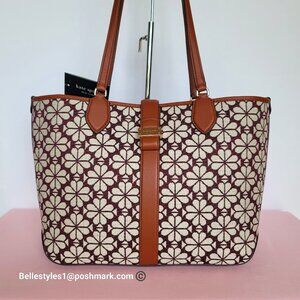 BRAND NEW WITH TAGS. Burgundy Multi. (Burgundy, Cream, Brown) A Medium open-top carryall Tote with spacious interior for your essentials with tab-over magnetic-snap closure. Crafted of New York style with Italian craftsmanship Spade flower textured jacquard fabric with smooth leather and PU trim.