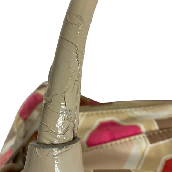 Handles are peeling. Bag is dirty inside and out. AS IS. NO RETURNS. Top width: 10", Height: 8", Depth: 4", Handle drop: 7".