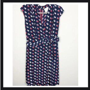 Faux wrap style. 100% silk sheath dress. Sleeveless. V-neck with hidden snap. Navy blue with red, white, and pink spot print