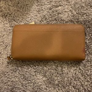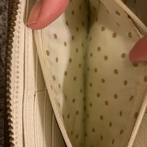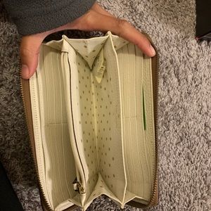 Small spot on back of wallet. Small spot inside of pocket. Inside it pretty nice, besides the normal wear in the coin pouch.