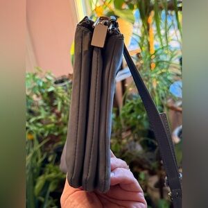 This is a small gray nylon crossbody bag by kate spade new york from the Wilson Road collection. It features silver hardware, a zip closure, and a detachable strap. The bag has a solid pattern, gray lining, and inner pockets.This pre-loved bag does have some light staining and would benefit from a light wash.