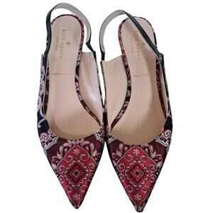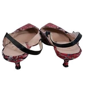 They feature a pointed toe, kitten heel, and a red paisley-like brocade pattern with black accents. The shoes have a slingback strap with an adjustable strap.