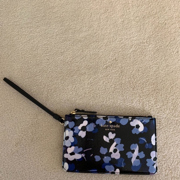 -LEATHER Kate Spade Wristlet: Floral Print (blue, white with black background) on front, Striped Back (black and white)