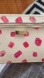 This stylish Kate Spade wristlet features a charming pink gift print on a white background. Perfect for adding a playful touch to any outfit.