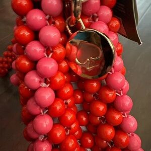 This mini bag, crafted from vibrant red and pink beads, exudes a retro charm reminiscent of the 1960s. Its compact size and unique beaded design make it a standout accessory for any occasion. The long beaded strap adds a touch of elegance, making it both stylish and functional.