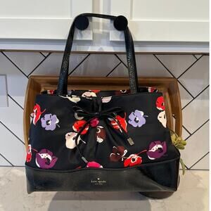 KATE SPADE black floral poppy print nylon patent leather satchel tote bow accent