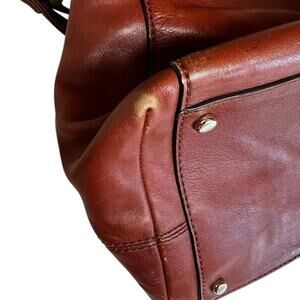 Normal surface scuffs and some rubbing on corners of leather. *there is a quarter size discoloration in leather on side. Small feet pegs on bottom so bag doesn’t sit directly on floor. Magnetic snaps to close compartments, antique brass hardware . This bag could hold a lot of your items; as it is very roomy. Lovely bag!