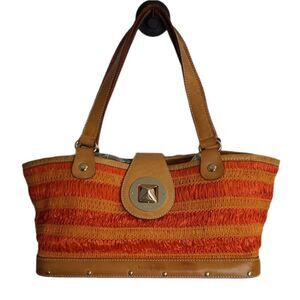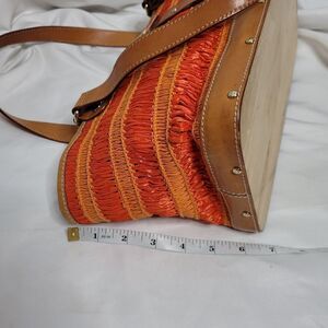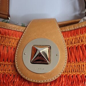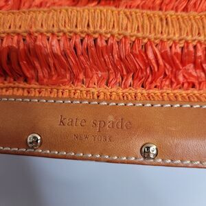 KATE SPADE orange sherbet leather trim raffia wood bottom shoulder bag purse
