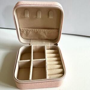 6. Travel Jewelry Case, pink, zip closure 3.75" x 3.75" x 2", 8 ring slots, pouch pocket, 3 hangers