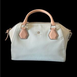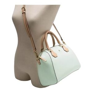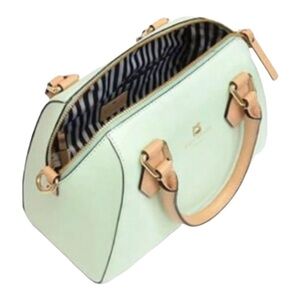 Perfect spring bag, mint green white tan handle and crossbody strap, top zip closure, stripe print interior, inside zip pocket, inside two open pockets, amazing condition, there are two call outs, a small smudge on the bottom of the bag and a small smudge on one corner, please see the last two pictures
