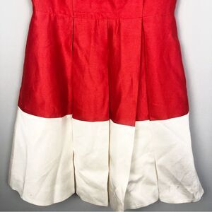 Gorgeous fit and flare dress by Kate Spade New York. Sleeveless (stock photo shows cap style sleeve but the dress is sleeveless). Coral orange with cream/ivory block. Silk blend gives it a sheen. Knee length. Pockets!! A couple small marks as shown but just needs to be dry cleaned. Womens size 6.