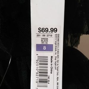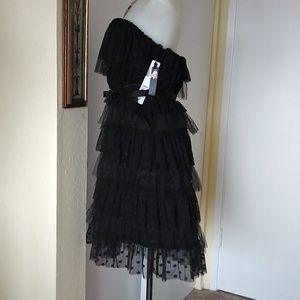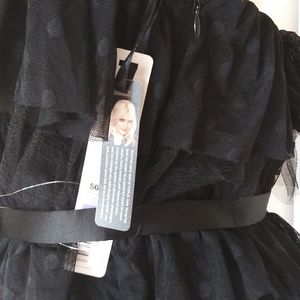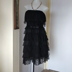 Strapless black dress with polka-dot fabric size 8 and ziper on the right side and belt of brooches and a bra inside. is New
