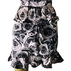 This is a beautiful roses print ruffle dress by Kate Young for Target size 2. Fabric is 100% polyester, machine-washable, and dress is fully-lined. Item has back-zip closure and rhinestone button at back of neck. Beautiful ruffled peplum and front ruffle detailing. Approximate measurements are 34 inches at bust, 26 inches at waist, 36 inches at hips, 36 inches in length. Pretty gathered detailing at front collar. Item sold in gently-used condition.