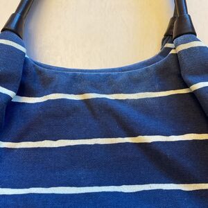 KATE SPADE NAVY with White Stripes Canvas Bag with Brown Leather Handles & Trim in very good condition. Minor fading on some edges, light discoloration on the inside lining please see last photo. Price offered reflects these issues.