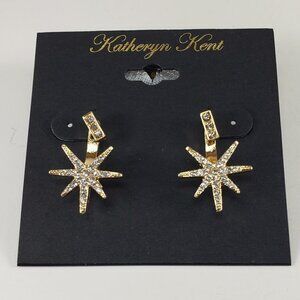 Enhance your style with these KATHERYN KENT Women's Gold Tone Sparkling 2-in-1 Stud Earrings, featuring a dazzling star ear jacket. These versatile earrings have a 1-inch drop with a delicate 0.25-inch bar. You can wear them together for a striking look or separate them for a more subtle effect. Elevate your fashion game with this unique accessory. NWT