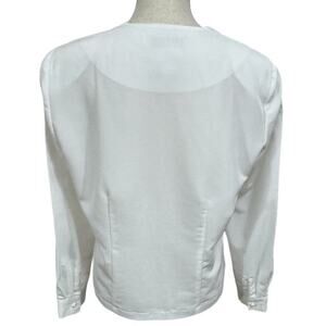 This vintage Kathie Lee blouse is a stunning addition to any wardrobe. The lacy, sheer fabric creates a delicate and feminine look, while the button detailing adds a touch of sophistication. The blouse features a pure white color that pairs well with any outfit, making it a versatile piece for any occasion. The blouse is designed with a cottage core style, making it perfect for those who love the vintage look. It is available in a regular size 4, and the angel-inspired design adds a touch of whimsy to any outfit. This blouse is perfect for any woman who wants to add a touch of elegance to her wardrobe...25"T x 19"W x24" ARM
