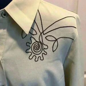 Kathy Che western inspired embroidered long sleeve button up. Light green. See tag photo for best color representation. Size M. 94% polyester, 6% spandex. Box hem. Bust 20”, shoulder to hem 23”, sleeves 23”. All measurements are approximate. Excellent condition! No stains or signs of wear. Thank you for coming by our closet. We are a fast shipper! F345 B8