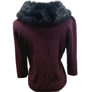 The KATHY IRELAND Vintage Women's Large Burgundy faux fur collar sweater from the 90s is a stylish and cozy option for winter and fall. Made from faux fur, wool, and acrylic, this cardigan features a tight-knit fabric with a solid burgundy color and a classic fit. The 3/4 sleeve and collared neckline add a touch of elegance, making it suitable for various occasions such as travel, parties, or business meetings. With a Barbie-inspired character and vintage charm, this sweater is sure to be a standout piece in any woman's wardrobe.