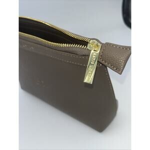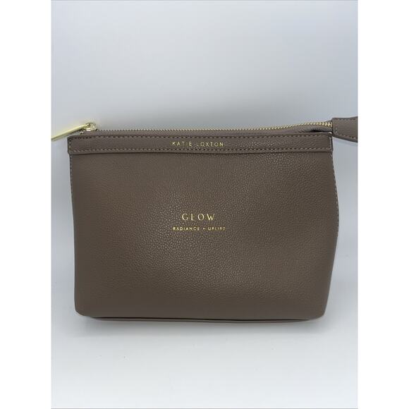 KATIE LOXTON LONDON glow, radiance, uplift makeup case pouch clutch 10”x7”x 2” brown cognac with gold tone accents