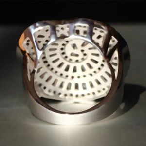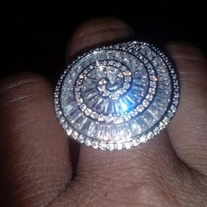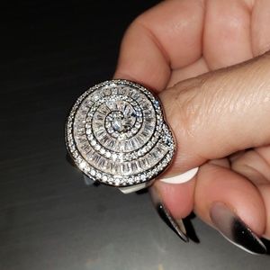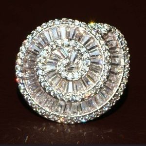 Never ending sterling (.925) silver swirl of white sapphires. Mesmerizing design and excellent quality. Yes, it is that dazzling in person! Show stopper.