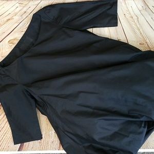 Jet black sheath dress with sheen. Boat neck, half length sleeves and an asymetrical draped bubble skirt. Pull on, no zippers. Lots of volume in skirt, quality drape. Worn once, in gently used condition ready to wear. Polyester fabric. Super fun little dress. Logo tag at neck. Says size 1. See measurements.I ship fast.